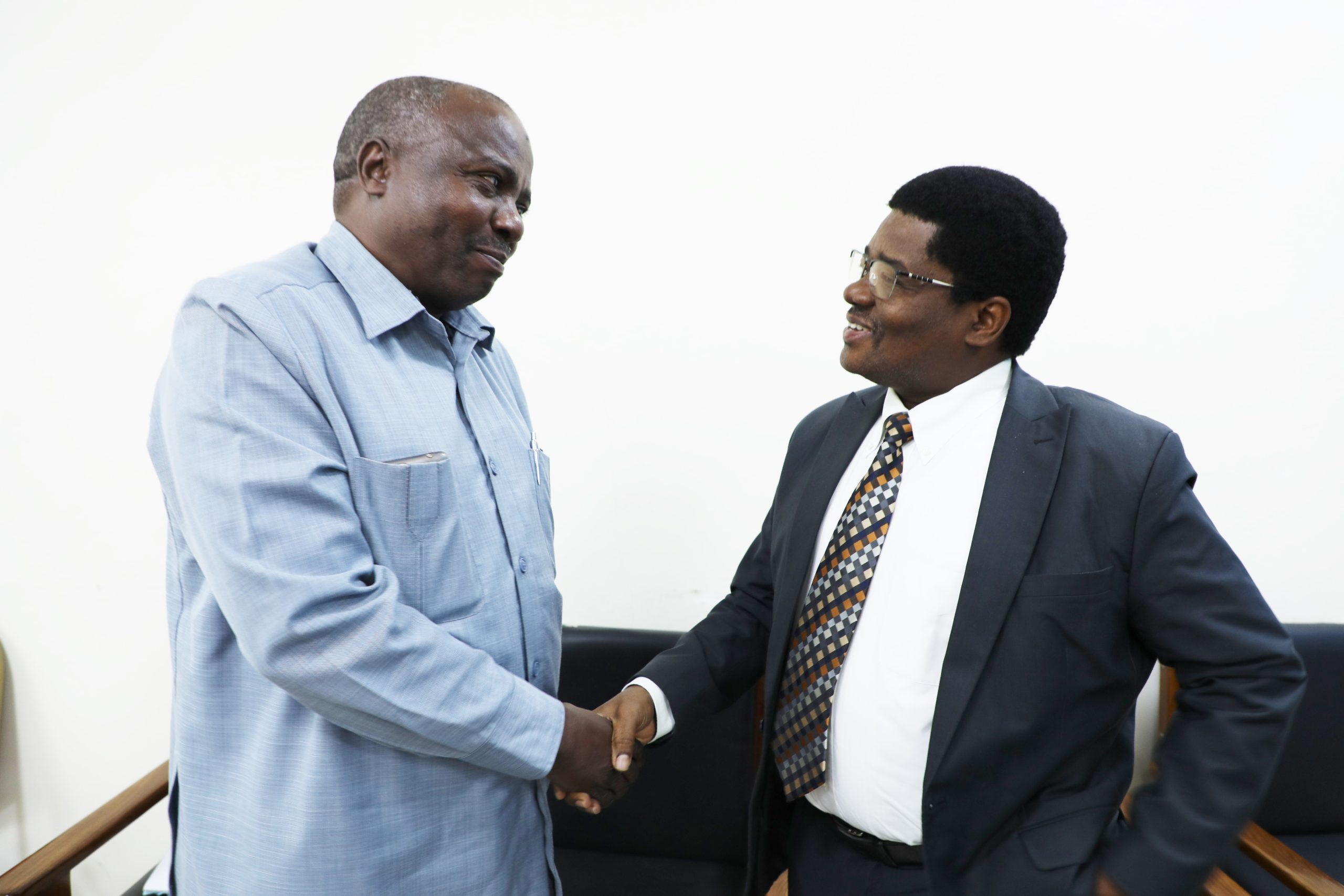 Naibu Katibu Mkuu Wizara ya Mambo ya Ndani ya Nchi, Dkt. Maduhu Kazi (kulia), akisalimiana na Kiongozi wa Shirika la Uzalishaji Mali la Jeshi la Polisi, ACP Beatus Silla, baada ya kikao cha Shirika hilo kilichoongozwa na Waziri wa Wizara hiyo, jijini Dodoma, leo. Picha na Wizara ya Mambo ya Ndani ya Nchi.