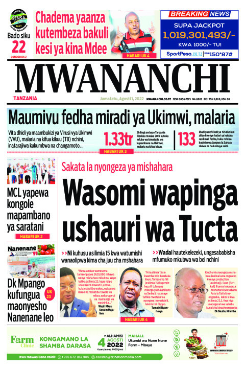 MagazetiPITIA VICHWA VYA HABARI KATIKA MAGAZETI YA LEO AGOSTI 1,2022 Last updated: 2022/07/31 at 11:23 PM Alex Sonna 3 years ago Share SHARE Alex Sonna July 31, 2022 July 31, 2022 Share this Article Facebook Twitter Email Print Previous Article MAOMBI YA MSAADA WA NAULI KWA AJILI YA MATIBABU NJE YA NCHI Next Article RISASI YAIFUMUA KOLANDOTO BONANZA LA MICHEZO CHUO CHA SAYANSI ZA AFYA KOLANDOTO