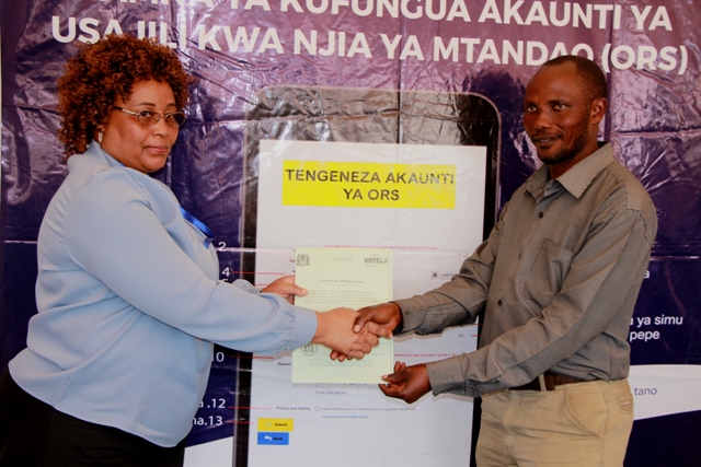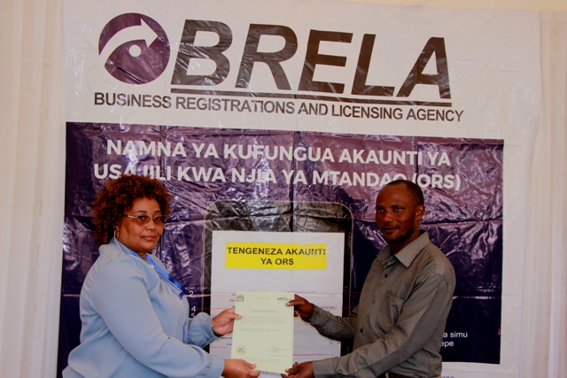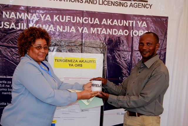 Afisa wa Wakala wa Usajili wa Biashara na Leseni wa BLERA Anna Nderingo (kushoto) akimkabidhi zawadi ya kikombe mwandishi wa habari Emmanuel Lengwa mara baada ya kusajili jina la Biashara yake na kufanikiwa kupewa Cheti chake Papo kwa hapo.