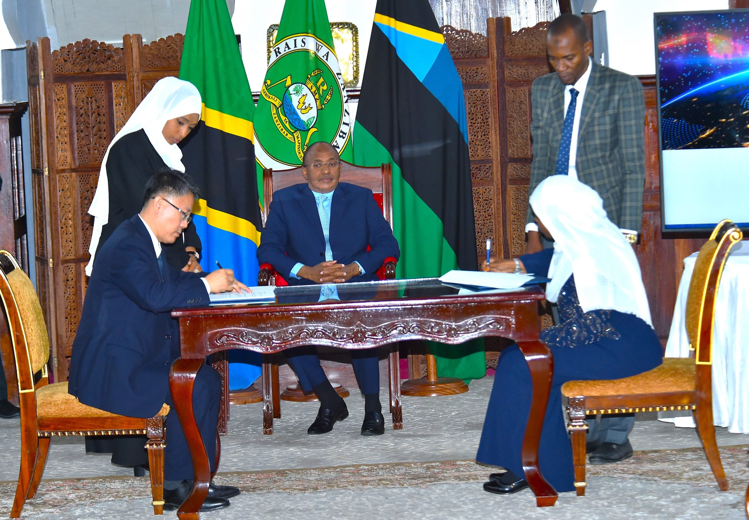 RAIS wa Zanzibar na Mwenyekiti wa Baraza la Mapinduzi Mhe.Dk.Hussein Ali Mwinyi akishuhudia utiaji wa Saini ya Mradi wa Ujenzi wa Barabara za Juu (Flyover) katika Mkoa wa Mjini Magharibi Unguja, kwa upande wa Serekali ya Mapinduzi Zanzibar amesaini Katibu Mkuu wa Wizara ya Ujenzi Mawasiliano na Uchukuzi Zanzibar Bi.Khadija Khamis Rajab na kwa upande wa Kampuni ya CCECC kutoka China amesaini Mkurugenzi Muendeshaji Bw. Zhang Junle Le, hafla hiyo iliyofanyika katika ukumbi wa Ikulu Jijini Zanzibar