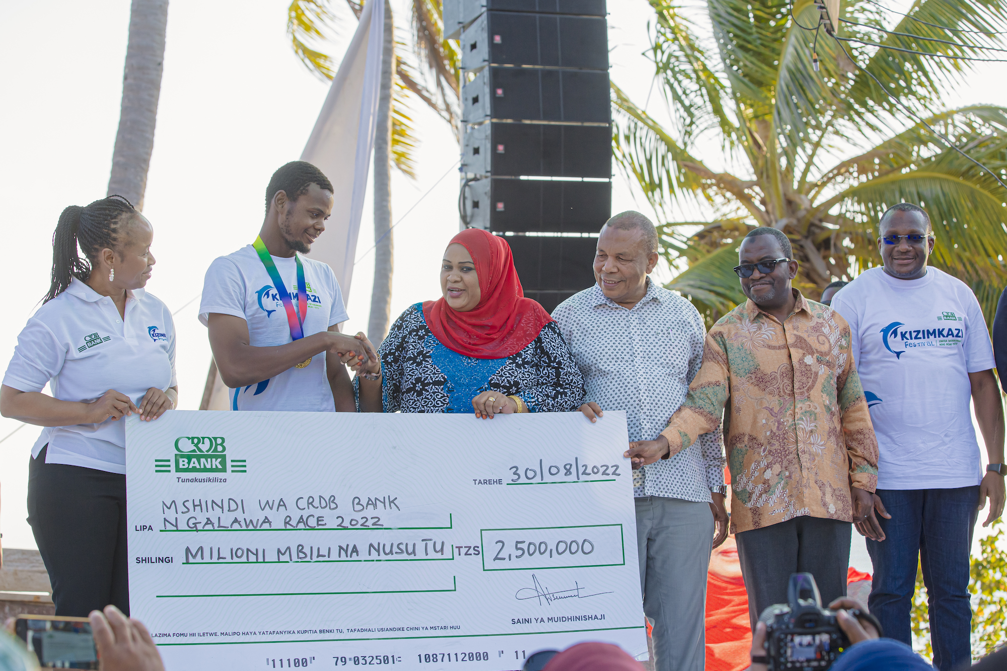 Waziri wa Maendeleo ya Jamii wa Serikali ya Mapinduzi Zanzibar, Riziki Pembe Juma (watatu kushoto) akimkabidhi mfano wa hundi yenye thamani ya shilingi milioni mbili na nusu (2,500,000/-), Khatib Haji Hamis (wapili kushoto) aliyeibuka mshindi wa jumla katika mashindano ya ‘CRDB Bank Ngalawa Race’ yaliyoandaliwa na Benki ya CRDB katika Tamasha la Kizimkazi, yaliyofanyika leo Agosti 30, 2022 kwenye fukwe za Kizimkazi Mkunguni, Mkoa wa Kusini Unguja, Zanzibar. Wengine pichani kutoka kushoto ni Mkurugenzi wa Mawasiliano wa Benki ya CRDB, Tully Esther Mwambapa, Mkuu wa Mkoa wa Kusini Unguja, Rashid Hadid Rashid, Mkuu wa Wilaya ya Kusini, Rajab Yussuf Mkasaba pamoja na Mkurugenzi Mkuu wa CRDB Insurance Broker LTD, Wilson Mnzava. Picha zote na Othman Michuzi.