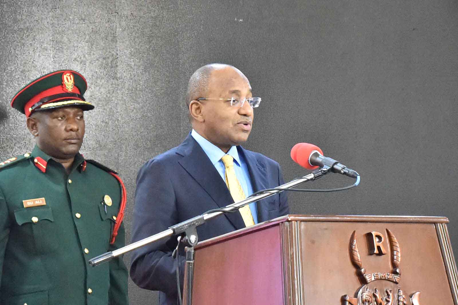 Rais wa Zanzibar na Mwenyekiti wa Baraza la Mapinduzi Dk.Hussein Ali Mwinyi (katikati) Mwenyekiti wa Bodi ya Umoja wa Makampuni ya Bima Mashariki na Kusini mwa Afrika Nd.Patt Karuihe -Matin (OESAI),(kushoto) na Kamishna wa Bima Tanzania Dkt.Baghayo Abdalla Saqware,Waziri wa Nchi Ofisi ya Rais,Fedha na Mipango Zanzibar Dkt.Saada Mkuya Salum (wa tatu kulia) Katibu wa Baraza la Mapinduzi na Katibu Mkuu Kiongozi Mhandisi Zena Ahmed Said,na Bi. Rose Wanda Katibu Mkuu Umoja wa Makampuni ya Bima Mashariki na Kusini mwa Afrika (OESAI) wakisimama wimbo wa Taifa ukipigwa katika ufunguzi wa Mkutano wa 44 wa Umoja wa Mashirika ya Bima, Ukanda wa Mashariki na Kusini Mwa Afrika