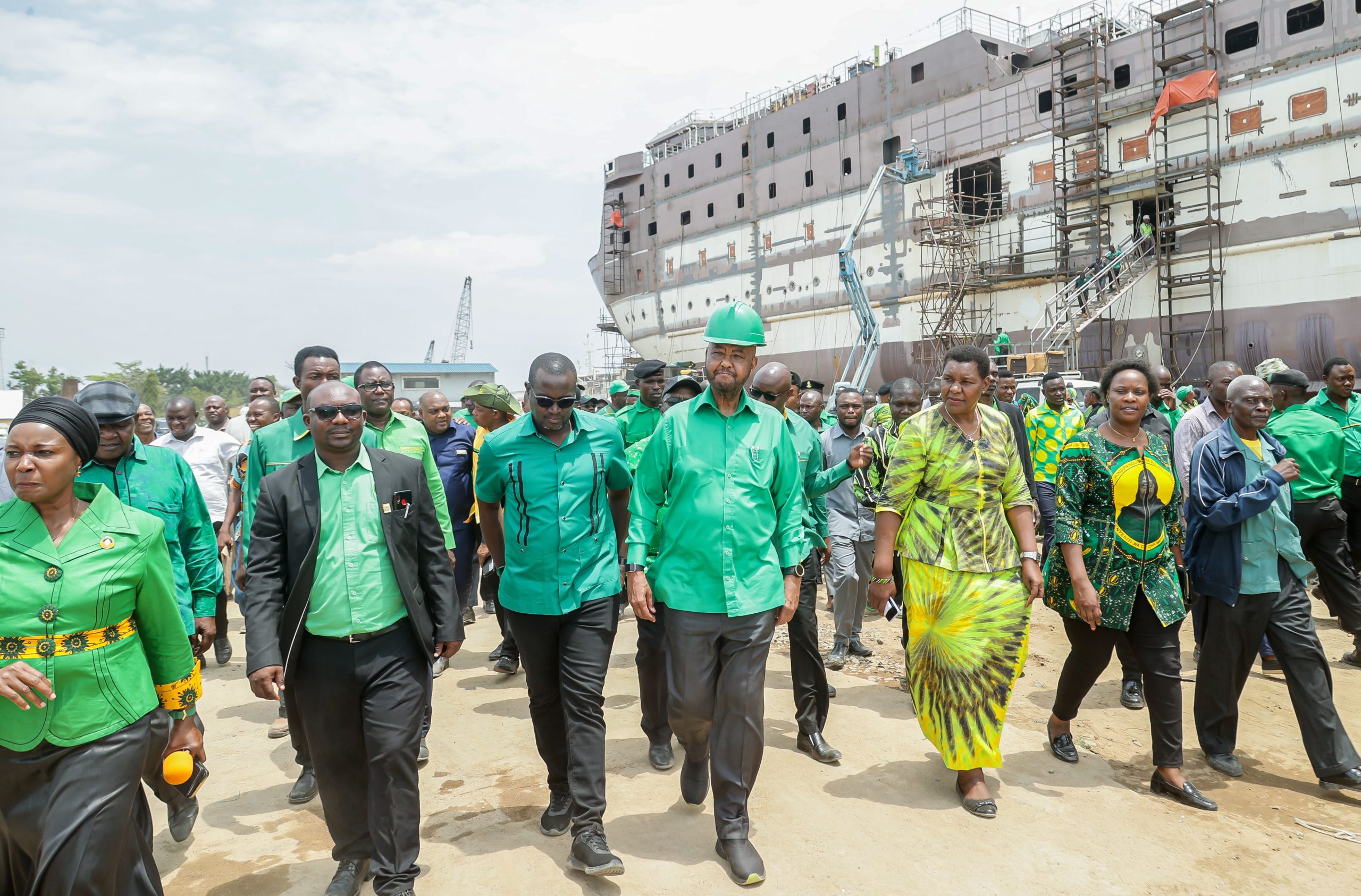 Makamu Mwenyekiti wa Chama Cha Mapinduzi (CCM) Kanali Mstaafu Abdulrahman Kinana, akikagua ujenzi wa Meli ya MV Mwanza, jijini Mwanza, akiwa katika ziara ya kukagua uhai wa Chama na utekelezaji wa Ilani ya Uchaguzi ya CCM 2020-2025.