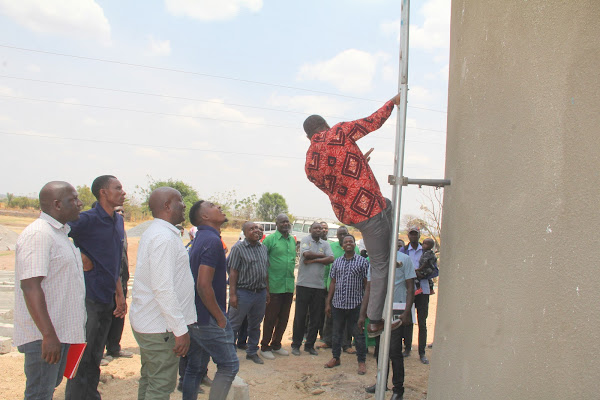 Mkuu wa wilaya ya Kishapu Mhe. Joseph Modest Mkude (katikati) akiwa amepanda kwenye ngazi za Tanki la maji katika Mradi wa maji ya bomba Mwamishoni – Nyasamba katika kata ya Bubiki unaotekelezwa na Mkandarasi Jonta Investment kwa usimamizi wa RUWASA Kishapu