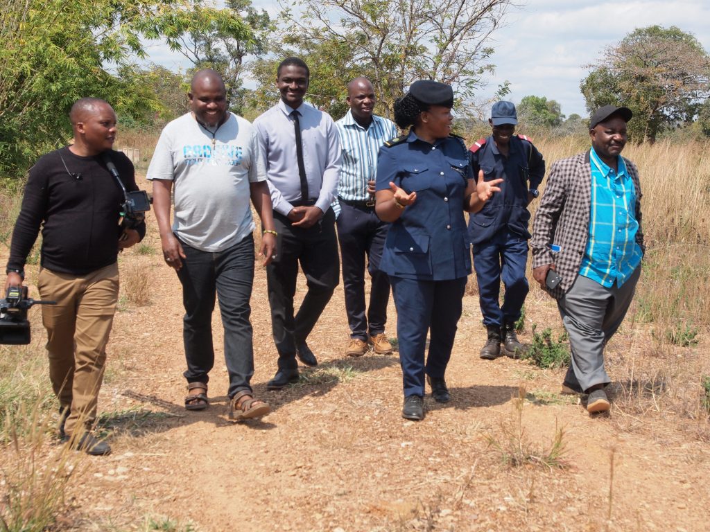 Mrakibu wa Uhamiaji kituo cha Mkenda wilayani Songea Upendo Kikudo wa kwanza kushoto akiwaongoza baadhi ya watumishi wa idara na taasisi za Serikali kukagua daraja la Mkenda linalounganisha nchi ya Tanzania na Msumbiji.