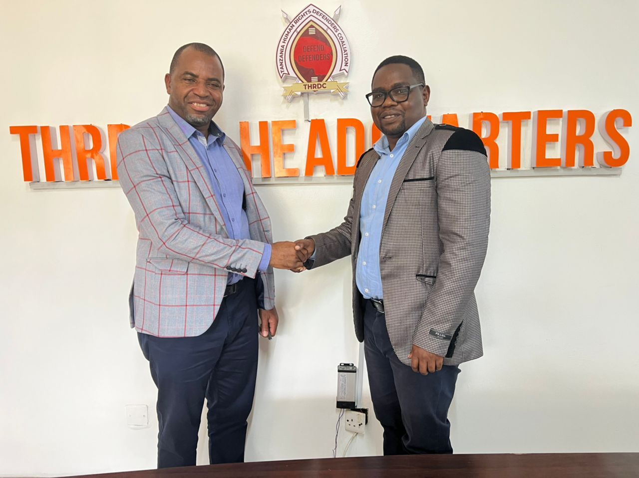 Mratibu wa Mtandao wa THRDC, Wakili Onesmo Olengurumwa pamoja na Mkurugenzi wa UTPC, Bw. Keneth Weston Simbaya wakati alipotembelea ofisi za Mtandao zilizopo Mikocheni B, Jijini Dar es Salaam mapema leo.