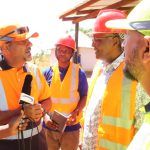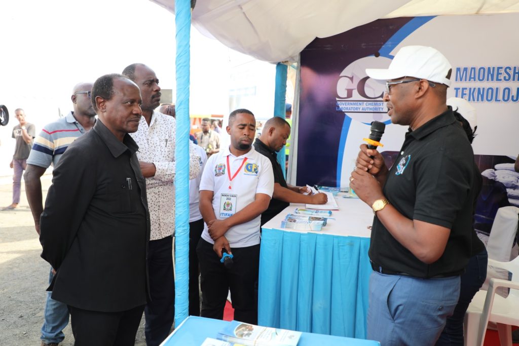 Naibu Katibu Mkuu Wizara ya Madini, Mhe. Msafiri Mbibo (kushoto), akipata maelezo kutoka kwa Meneja wa GCLA Ofisi ya Kanda ya Ziwa, Musa Kuzumila (kulia), kuhusu majukumu ya Mamlaka katika kuelimisha wachimbaji wa madini juu ya elimu ya matumizi salama ya kemikali katika shughuli zao za madini.