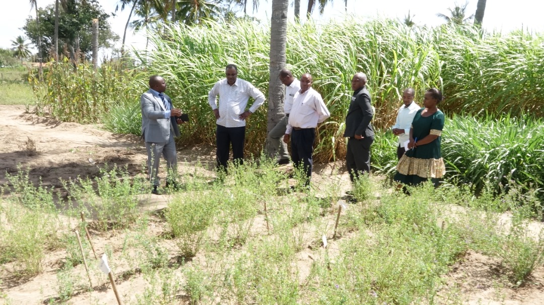 Waziri wa Mifugo na Uvuvi, Mhe. Mashimba Ndaki (wa pili kutoka kushoto) akikagua kipando cha malisho wakati alipotembelea Taasisi ya Utafiti wa Mifugo Kanda ya Mashariki Mkoani Tanga.