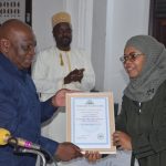 Rais wa Jamhuri ya Muungano wa Tanzania Mhe. Samia Suluhu Hassan akionesha moja ya mikataba wa Usimamiaji wa Shughuli za Lishe mara baada ya kuusaini katika hafla iliyofanyika kwenye ukumbi wa Halmashauri ya Jiji la Dodoma