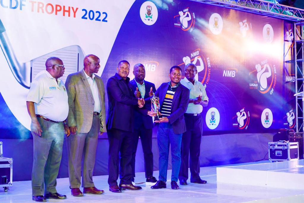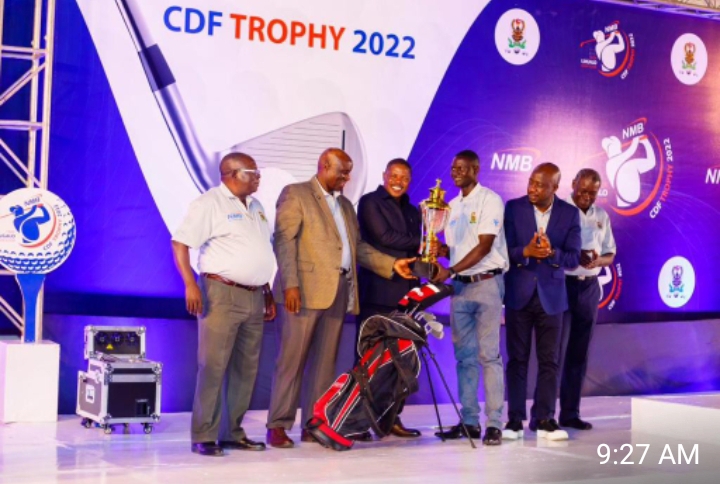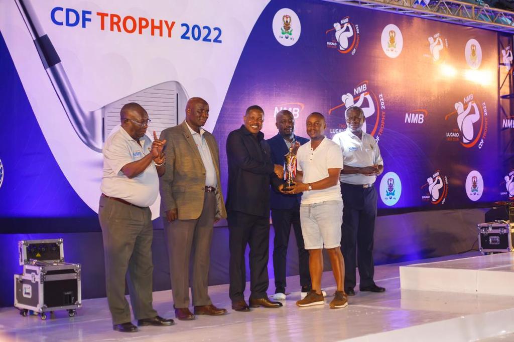 Mkuu wa Majeshi ya Ulinzi Tanzania, Jenerali Jacob Mkunda akimkabidhi Kikombe mshindi kutoka timu ya NMB, Bw. Sigfrid Ophishas kwenye mashindano ya NMB CDF TROPHY 2022, yaliyofanyika katika viwanja vya Golf Lugalo, Dar es Salaam. Kulia ni Afisa Mkuu wa Biashara na Wateja Binafsi, Filbert Mponzi na kushoto ni Mkuu wa Majeshi wa Malawi, Generali Vincent Nundwe.