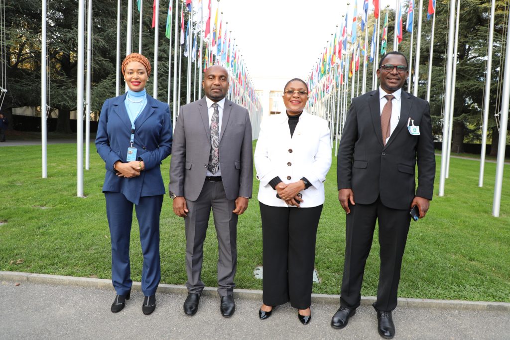 Waziri wa Mambo ya Ndani ya Nchi, Mhandisi Hamad Masauni (wapili kushoto) akiwa katika picha ya pamoja na Balozi na Mwakilishi wa Kudumu wa Tanzania, nchini Uswisi, Maimuna Tarishi (wapili kulia), Balozi na Naibu Mwakilishi wa Kudumu nchini humo, Hoyce Temu (kushoto) na Mkurugenzi wa Idara ya Huduma kwa Wakimbizi, Sudi Mwakibasi, nje ya Ukumbi wa Mikutano wa Umoja wa Mataifa, jijini Geneva, nchini Uswisi, leo. Picha na Wizara ya Mambo ya Ndani ya Nchi.