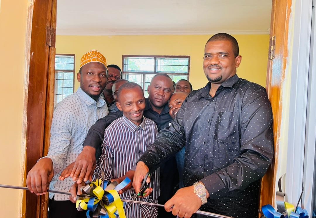 Naibu Waziri, Ofisi ya Rais, Menejimenti ya Utumishi wa Umma na Utawala Bora, Mhe. Deogratius Ndejembi akikata utepe kuzindua masijala ya ardhi katika Kijiji cha Mbondo, wakati wa ziara yake ya kikazi ya kukagua utekelezaji wa Mpango wa Kurasimisha Rasilimali na Biashara za Wanyonge (MKURABITA) katika Halmashauri ya Wilaya ya Nachingwea.