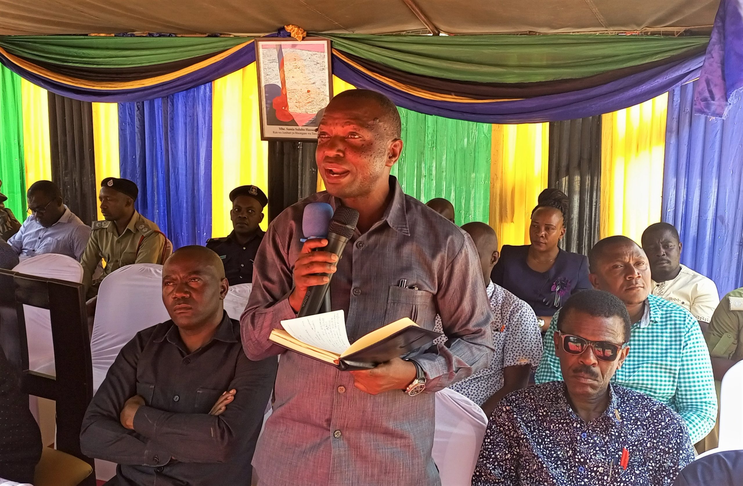 Mkuu wa Wilaya ya Nachingwea, Mhe. Hashim Komba akitoa neno la utangulizi kabla ya kumkaribisha Naibu Waziri, Ofisi ya Rais, Menejimenti ya Utumishi wa Umma na Utawala Bora, Mhe. Deogratius Ndejembi kuzungumza na wananchi wa Kijiji cha Nakalonji wakati ziara ya kikazi ya Naibu Waziri huo iliyokuwa na lengo la kukagua utekelezaji wa Mpango wa Kurasimisha Rasilimali na Biashara za Wanyonge (MKURABITA) katika Halmashauri ya Wilaya ya Nachingwea.