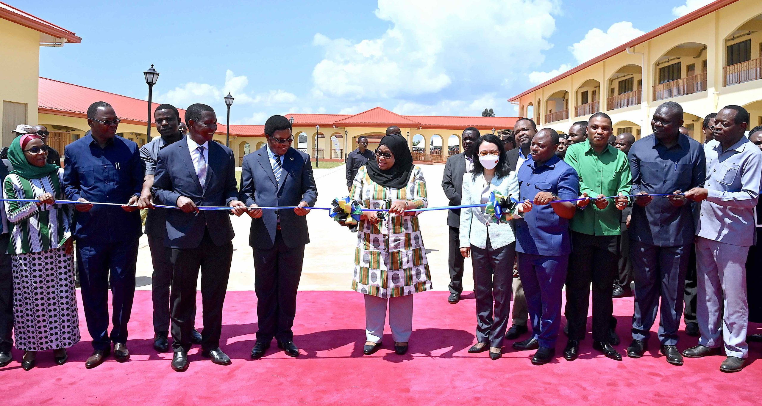 Rais wa Jamhuri ya Muungano wa Tanzania Mhe. Samia Suluhu Hassan akikata utepe kuashiria kuzindua Chuo cha Ufundi Stadi na Huduma (VETA) kilichopo, Burugo kata ya Nyakato Bukoba Mkoani wa Kagera tarehe 13 Oktoba, 2022. Wengine katika picha ni Waziri Mkuu Mhe. Kassim Majaliwa, Balozi wa Jamhuri ya Watu wa China Mhe. Chen Mingjian, Waziri wa Elimu Profesa Adolf Mkenda, Mkuu wa Mkoa wa Kagera Albert Chalamila pamoja na viongozi mbalimbali wa Chama cha Serikali.