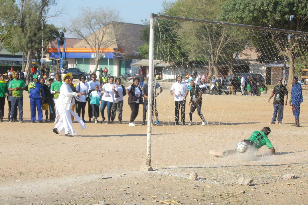 Katibu wa NEC Organaizesheni Chama cha Mapinduzi (CCM) Dk Maudline Castico,(akimchambua golikipa kwa Penalti kuashiria kuanza kwa mchezo wa Mpira wa Miguu kati ya Mapinduzi Sports Club dhidi ya Chang’ombe ambapo Chang’ombe wameibuka na ushindi wa mabao 3-2 wakati wa bonanza la kuadhimisha miaka 23 ya kifo cha Mwalimu Nyerere lilofanyika leo Oktoba 14,2022 Jijini Dodoma katika viwanja vya Mtekelezo na Jamhuri.
