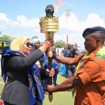 Rais wa Jamhuri ya Muungano wa Tanzania Mhe. Samia Suluhu Hassan akiwa na Waziri wa Ujenzi na Uchukuzi Mhe. Profesa Makame Mbarawa pamoja na viongozi wengine wakati akikata utepe kuashiria ufunguzi wa barabara ya Kabingo-Nyakanazi km 50 iliyokamilika kujengwa kwa kiwango cha lami katika hafla fupi iliyofanyika Kakonko Mkoani Kigoma tarehe 16 Oktoba, 2022.