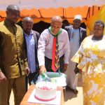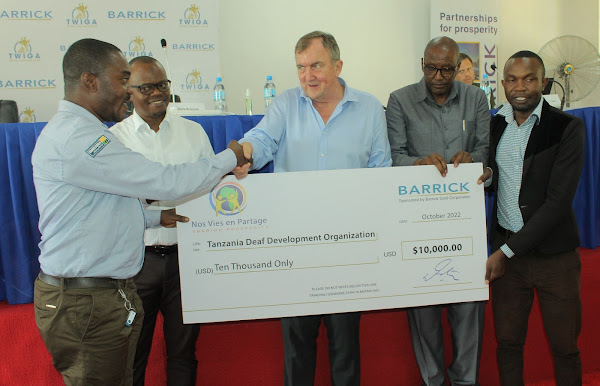 Rais na Afisa Mtendaji Mkuu wa Kampuni ya Barrick Gold Corporation, Mark Bristow, akikabidhi mfano wa hundi ya dola za 10,000 kwa Mkurugenzi wa taasisi ya Tanzania Deaf Development Association, Kelvin Nyewa, wakati wa hafla iliyofanyika mkoani Mara . Wa pili kulia ni Naibu Waziri wa Madini, Dk. Steven Kiruswa na Mkuu wa mkoa wa Simiyu na Kaimu Mkuu wa Mkoa wa Mara,Bw.Yahya Nawanda (Kushoto)
