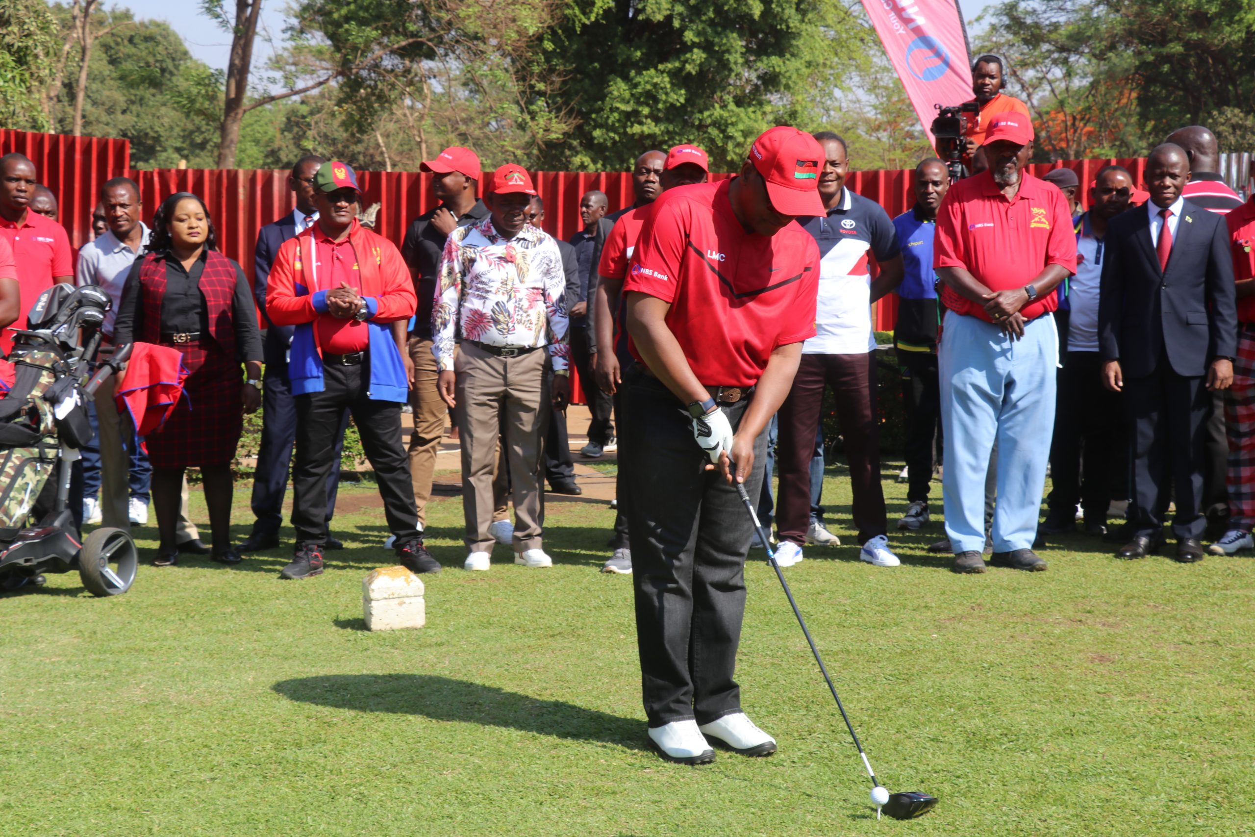Rais wa Malawi Mh Lazarus Chakwera akipiga mpira wa gofu ikiwa ishara ya kuzindua Mashindano ya Kuwaenzi Maveterani wa Vita jana (Ijumaa) Lilongwe Malawi (Picha na Meja Selemani Semunyu).
