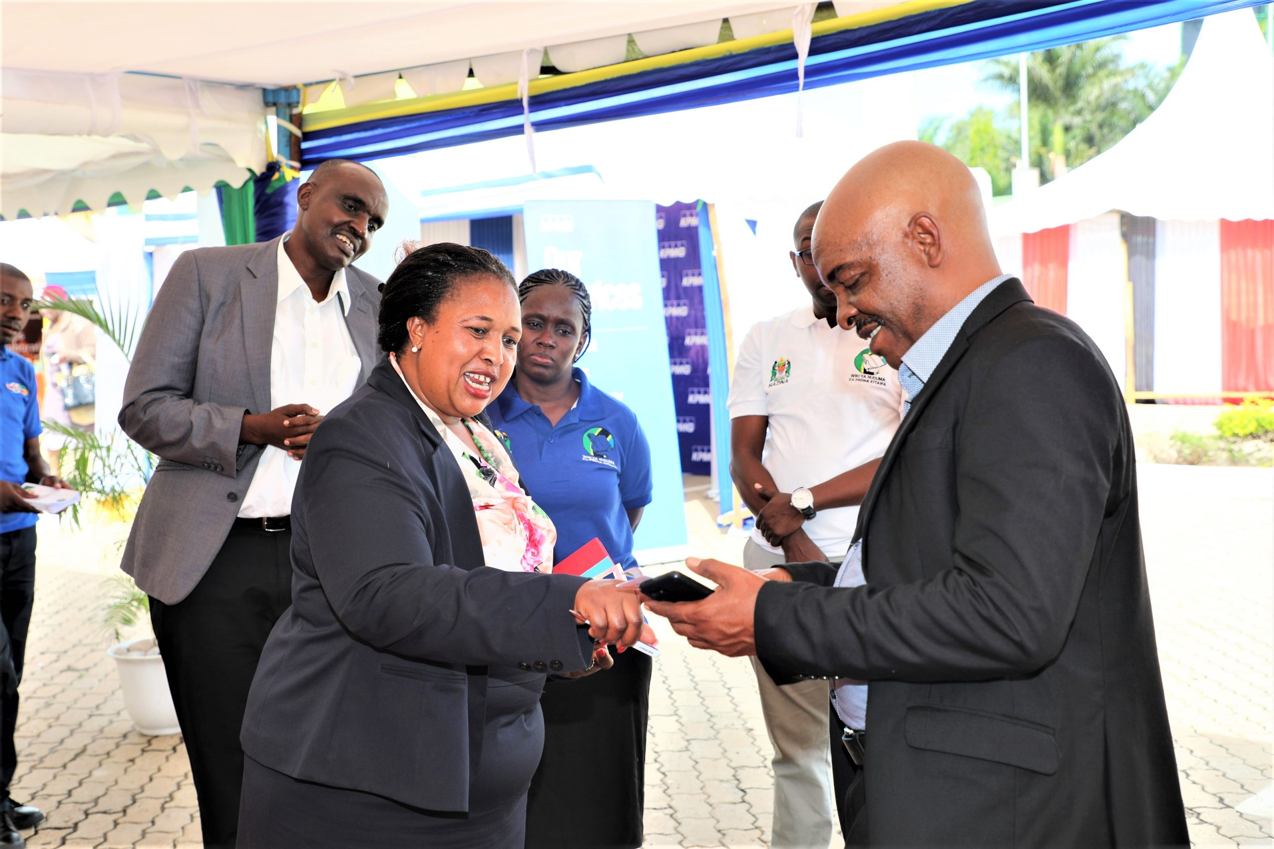 Mkuu wa Mkoa wa Mara, Meja Generali Suleiman Mzee, akioneshwa mifumo ya malipo na Kamishna Msaidizi wa Idara ya Uendelezaji wa Sekta ya Fedha, Bi. Dionisia Mjema, alipotembelea katika maadhimisho ya Wiki ya Huduma za Fedha Kitaifa, yanayoendelea katika Viwanja vya Rock City Mall, jijini Mwanza.
