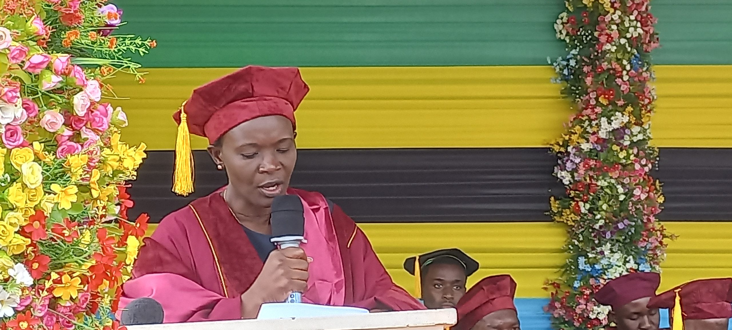 Mkurungezi wa Chuo Cha Afya Cha Mtakatifu Maximilliancolbe Elizabeth Nkonyoka akitoa wito kwa wanachuo waliomaliza miaka 3 ya kozi ya utabibu na ufamasia .