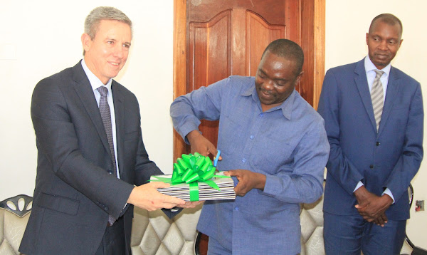 Mkurugenzi Mtendaji wa Kampuni ya Petra Diamonds Limited, inayomiliki Mgodi wa Almasi wa Mwadui, Richard Duffy akimkabidhi Mwenyekiti wa Halmashauri ya Wilaya ya Kishapu, Mhe. William Jijimya Vitendea kazi vya baraza huru la usuluhishi wa malalamiko ya wananchi katika mgodi wa Mwadui
