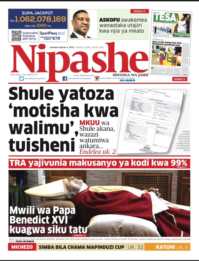 MagazetiPITIA VICHWA VYA HABARI KATIKA MAGAZETI YA LEO JANUARY 3,2023 Last updated: 2023/01/03 at 2:24 AM Alex Sonna 3 years ago Share SHARE Alex Sonna January 3, 2023 January 3, 2023 Share this Article Facebook Twitter Email Print Previous Article JAJI DKT. JOHN UTAMWA AFARIKI DUNIA Next Article MKE WA RAIS WA ZANZIBAR MAMA MARIAM MWINYI AMEGAWA VIFAA VYA UVUVI MICHEWENI