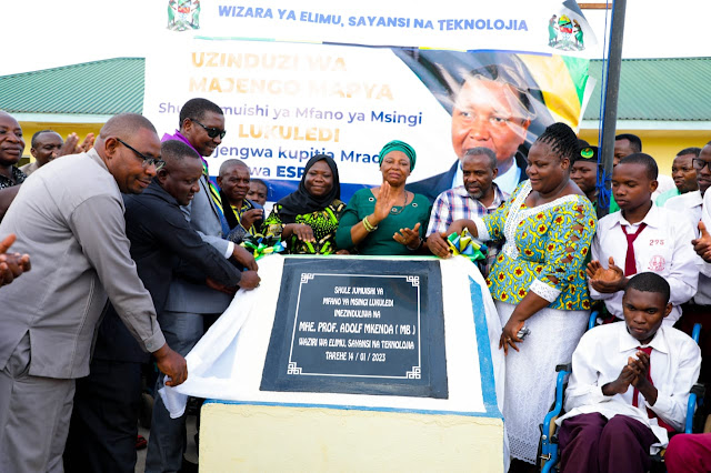 Waziri wa Elimu, Sayansi na Teknolojia, Prof.Adolf Mkenda akizungumza wakati wa uzinduzi wa Shule Jumuishi ya Mfano ya Msingi Lukuledi iliyojengwa na Wizara ya Elimu kupitia Mradi wa Elimu na Kuendeleza Ujuzi na Stadi za Kazi (ESPJ).Waziri wa Elimu, Sayansi na Teknolojia, Prof.Adolf Mkenda akizindua rasmi majengo ya Shule Jumuishi ya Mfano ya Msingi Lukuledi iliyojengwa na Wizara ya Elimu kupitia Mradi wa Elimu na Kuendeleza Ujuzi na Stadi za Kazi (ESPJ)