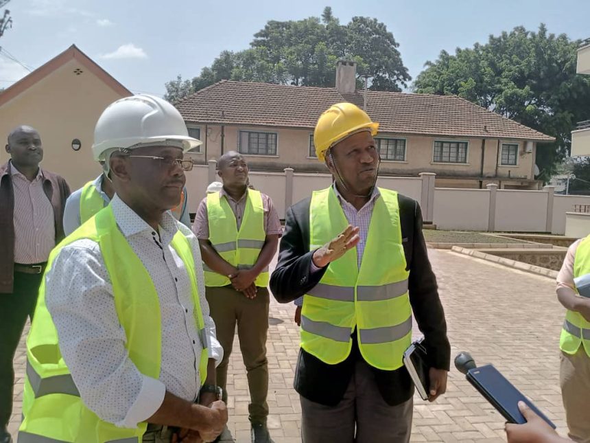 Waziri wa ujenzi na uchukuzi, Profesa Makame Mbarawa akipata maelezo ya mradi huo kutoka kwa Kaimu Meneja wa TBA mkoa wa Arusha ,Mhandisi Juma Dandi akiwa ziarani mkoani Arusha.