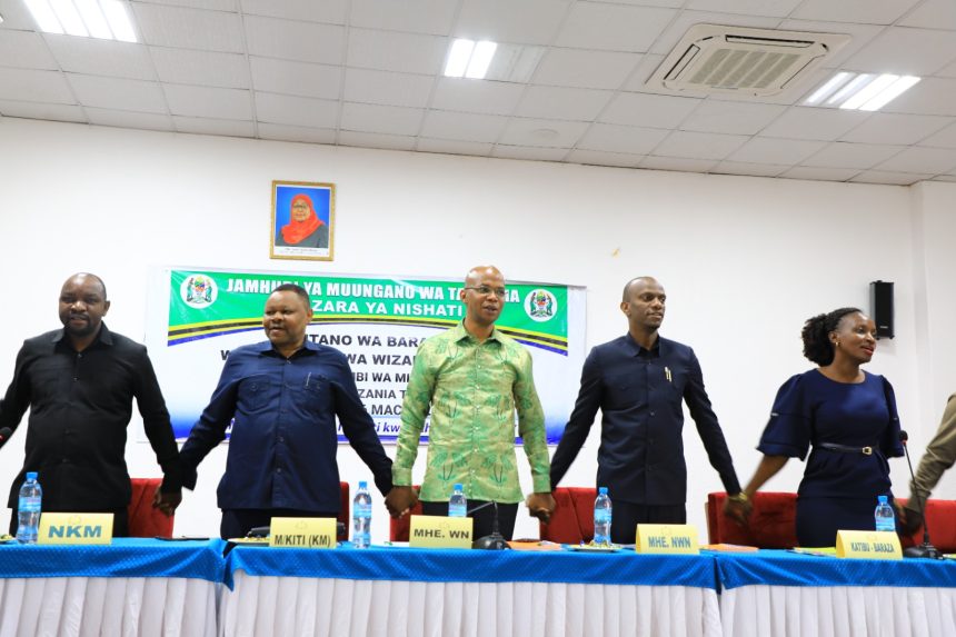 Waziri wa Nishati, Mhe.January Makamba (katikati) na viongozi wengine wa Wizara wakiimba Wimbo wa Wafanyakazi wa Mshikamano kabla ya kufungua Mkutano wa Baraza la Wafanyakazi wa Wizara ya Nishati jijini Arusha. Wa Tatu kutoka kulia ni Naibu Waziri wa Nishati, Wakili Stephen Byabato, Wa Tatu kushoto ni Katibu Mkuu wa Wizara ya Nishati, Mhandisi Felchesmi Mramba, Wa Pili kushoto ni Naibu Katibu Mkuu Wizara ya Nishati, Athuman Mbuttuka na wa kwanza kulia ni Katibu wa Baraza la Wafanyakazi Wizara ya Nishati, Fortunata Getele.