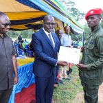 Katibu Mkuu wa Chama Cha Mapinduzi Ndugu Daniel Chongolo akipokea medali kutoka kwa mwanariadha wa kimataifa wa zamani Mzee John Stephen Akhwari (kushoto) kama ishara ya upendo kwa kufanya ziara wilayani Mbulu mkoa wa Manyara.