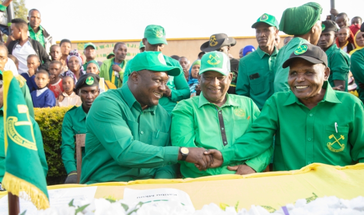 Katibu Mkuu wa Chama Cha Mapinduzi Ndugu Daniel Chongolo akisalimiana na Balozi Mhe. Philip Marmo (kulia) wakati wa mkutano na wanachama wa CCM Mbulu, katikati ni Mwenyekiti wa CCM Wilaya ya Mbulu Ndugu Malkiadi Nari.