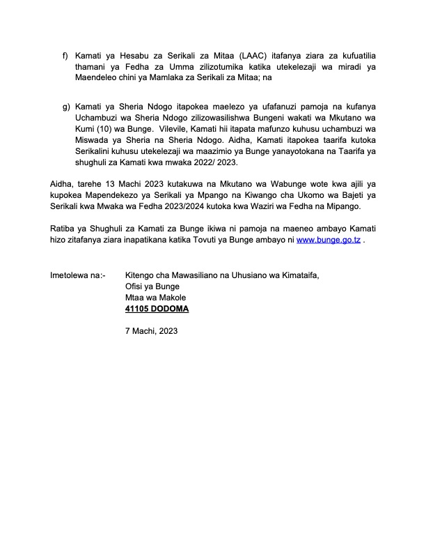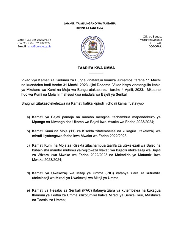 MchanganyikoTAARIFA KWA UMMA KUHUSU KUANZA KWA VIKAO VYA KAMATI ZA BUNGE Last updated: 2023/03/07 at 11:36 AM Alex Sonna 3 years ago Share SHARE Alex Sonna March 7, 2023 March 7, 2023 Share this Article Facebook Twitter Email Print Previous Article WAZIRI DKT MABULA AZITAKA HALMASHAURI NCHINI KUVIANDAA VIJIJI KUWA NA MIJI ENDELEVU Next Article DKT. TAX AKUTANA KWA MAZUNGUMZO NA BALOZI WA UINGEREZA