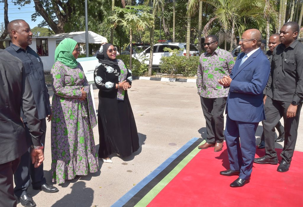 RAIS wa Zanzibar na Mwenyekiti wa Baraza la Mapinduzi Mhe.Dk.Hussein Ali Mwinyi akisalimiana na Waziri wa Habari,Vijana,Utamaduni na Michezo Zanzibar Mhe.Tabia Maulid Mwita, Katibu wa Baraza la Mapinduzi na Katibu Mkuu Kiongozi Mhandisi Zena Ahmed Said na Mstahiki Meya wa Jiji la Zanzibar.Mhe. Mahmoud Mohamed Mussa, alipowasili katika viwanja vya Ukumbi wa mkutano wa Sheikh Idrissa Abdulwakil Kikwajuni Wilaya ya Mjini Unguja Jijini Zanzibar kwa ajili ya ufunguzi wa Kongamano la Idhaa za Kiswahili Duniani,