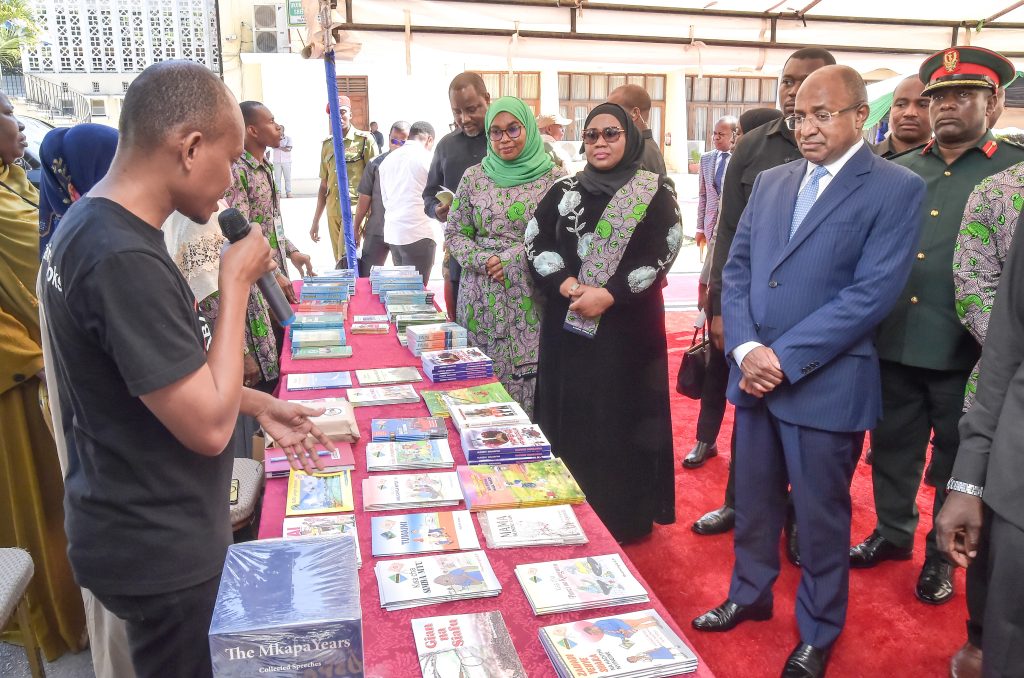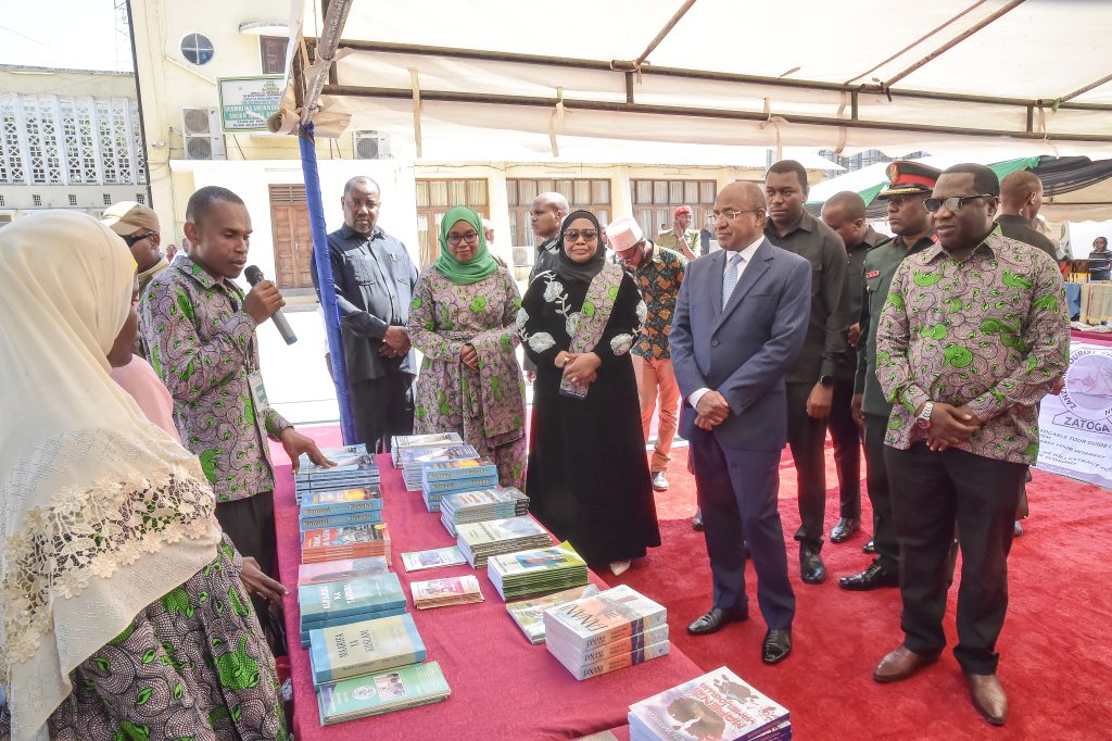 RAIS wa Zanzibar na Mwenyekiti wa Baraza la Mapinduzi Mhe.Dk.Hussein Ali Mwinyi akitembelea maonesho ya Vitabu na machapisho mbalimbali, wakati akitembelea maonesho na kupata maelezo ya vitabu kutoka kwa Afisa wa Baraza la Kiswahili Zanzibar Bw. Hassan Khamis,kabla ya kulifungua Kongamano la Idhaa za Kiswahili Duniani,(kushoto kwa Rais) Mkuu wa Mkoa wa Mjini Magharibi Unguja Mhe.Idrissa Mustafa Kitwana na (kulia kwa Rais) Waziri wa Habari,Vijana,Utamaduni na Michezo Zanzibar Mhe. Tabia Maulid Mwita na Katibu wa Baraza la Mapinduzi na Katibu Mkuu Kiongozi Mhandisi Zena Ahmed Said.