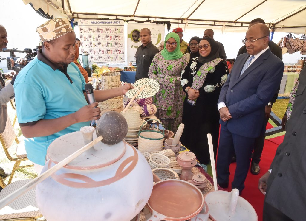 RAIS wa Zanzibar na Mwenyekiti wa Baraza la Mapinduzi Mhe.Dk.Hussein Ali Mwinyi akitembelea maonesho katika viwanja vya ukumbi wa Mikutano wa Sheikh Idrissa Abdulwakil Kikwajuni Wilaya ya Mjinin Unguja Jijini Zanzibar leo 18-3-2023,wakati akitembelea banda la maonesho la Bin Majid Decoration na kupata maelezo ya bidhaa za asili zinazotengenezwa kutoka kwa Bw.Makame Majid Suleiman.