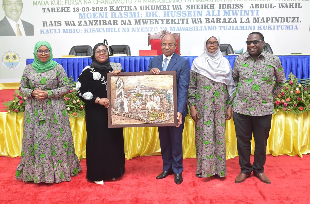 RAIS wa Zanzibar na Mwenyekiti wa Baraza la Mapinduzi Mhe.Dk.Hussein Ali Mwinyi akikabidhiwa TUZO Maalum na Waziri wa Habari,Vijana,Utamaduni na Michezo Zanzibar Mhe.Tabia Maulid Mwita, baada ya kulifungua Kongamano la Idhaa za Kiswahili Duniani linalofanyika katika Ukumbi wa Mikutano wa Sheikh Idrissa Abdulwakil Kikwajuni Wilaya ya Mjini Unguja Jijini Zanzibar leo 18-3-2023, na (kushoto kwa Rais) Mwenyekiti wa Baraza la Kiswahili Zanzibar (BAKIZA) Dkt. Saade Said Mbarouk na Mkuu wa Mkoa wa Mjini Magharibi Unguja Mhe. Idrissa Mustafa Kitwana na (kulia kwa Waziri) Katibu wa Baraza la Mapinduzi na Katibu Mkuu Kiongozi Mhandisi Zena Ahmed Said.(Picha na Ikulu)
