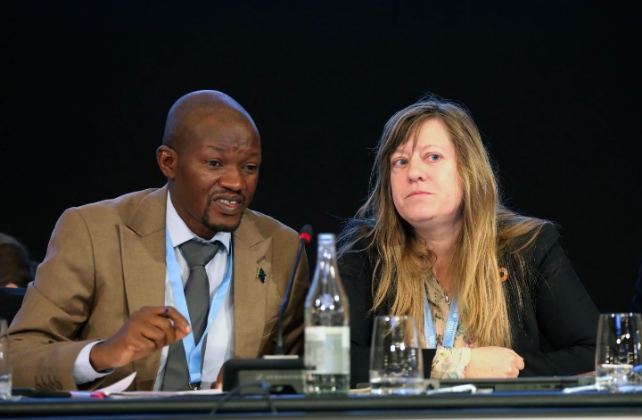 Kaimu Mkurugenzi Mkuu wa TMA, Dkt. Ladislaus Changa, na Afisa Kiungo wa Tanzania katika Jopo la IPCC (aliyekaa mkono wa kushoto) akiongoza kikao cha kamati ya jopo hilo (Contact Group) katika mkutano wa 58 wa IPCC (IPCC 58) uliofanyika Interlaken, Uswiss kuanzia tarehe 13 hadi 18 Machi, 2023. Aliyeketi kushoto kwake ni Bi. Tina Christensen (Mwenyekiti mwenza) kutoka Denmark.