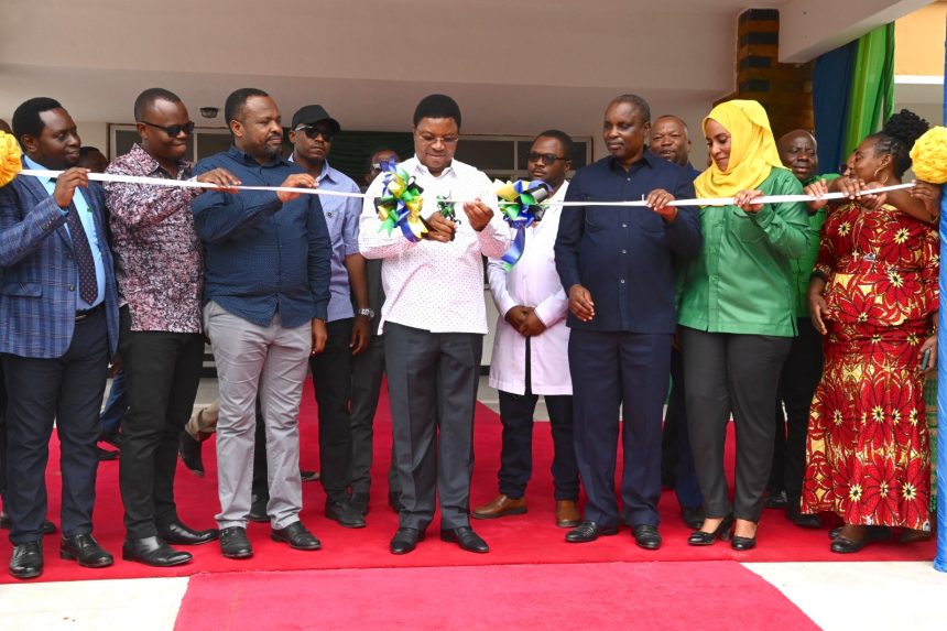 Waziri Mkuu, Kassim Majaliwa akikata utepe wakati alipozindua Jengo la Wagonjwa wa Dharura katika hospitali ya wilaya ya Maswa mkoani Simiyu, Machi , 26, 2023. Kushoto ni Waziri Ofisi ya Rais TAMISEMI, Dkt. Festo Dugange. (Picha naOfisi ya Waziri Mkuu)