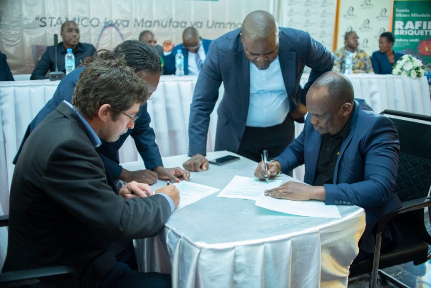 Kaimu Mkurugenzi Mtendaji wa Kampuni ya Geita Gold Mining Limited (GGML), Elder Damon (kushoto) akisaini mkataba kati ya kampuni hiyo na Shirika la Madini la Taifa Stamico) wenye thamani ya Sh bilioni 55.2 kwa lengo la kuendeleza shughuli za uchorongaji miamba kwenye migodi ya kampuni hiyo. Kulia na Mkurugenzi Mtendaji wa STAMICO, Dk. Venance Mwasse.