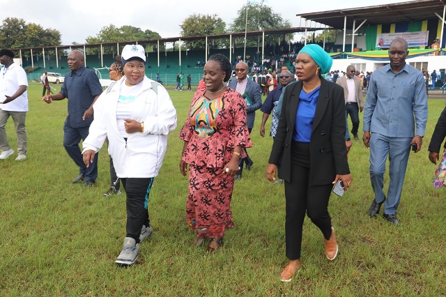 Mhe. Fatma Mwasa (amevaa kofia nyeupe) wakikagua Uwanja wa Jamhuri Morogoro