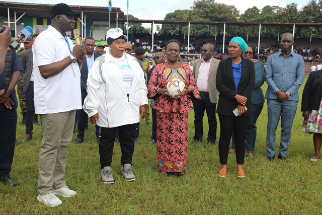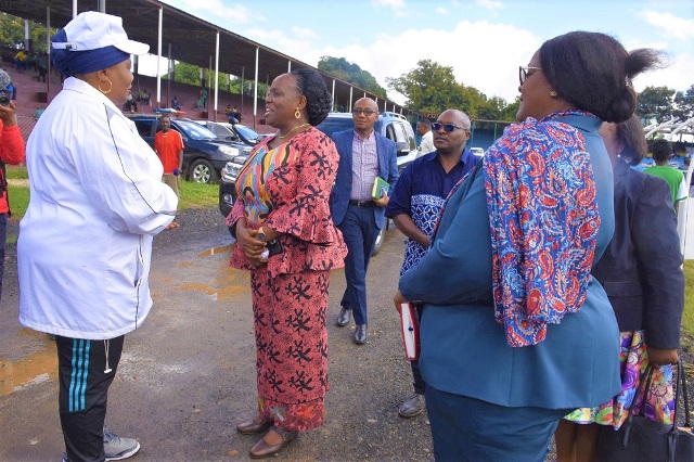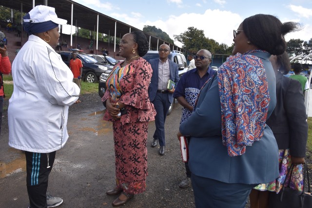Mhe. Prof. Joyce Ndalichako (amevaa batiki) akikagua timu ya mpira wa miguu ya