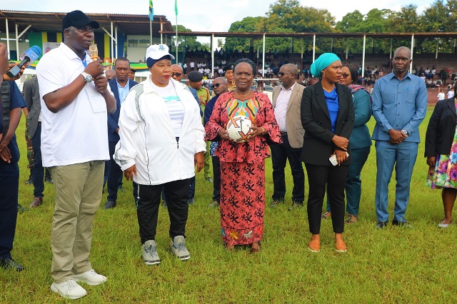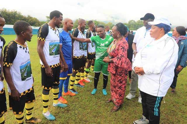 Ndalichako (ameskilikia mpira) na wa pili kushoto ni Mkuu wa Mkoa wa Morogoro Mhe.