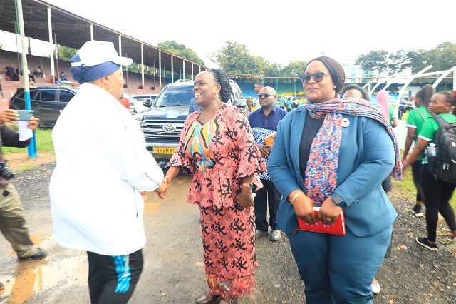 Mhe. Fatma Mwasa (amevaa kofia nyeupe) mara baada ya kuwasili Uwanja wa Jamhuri