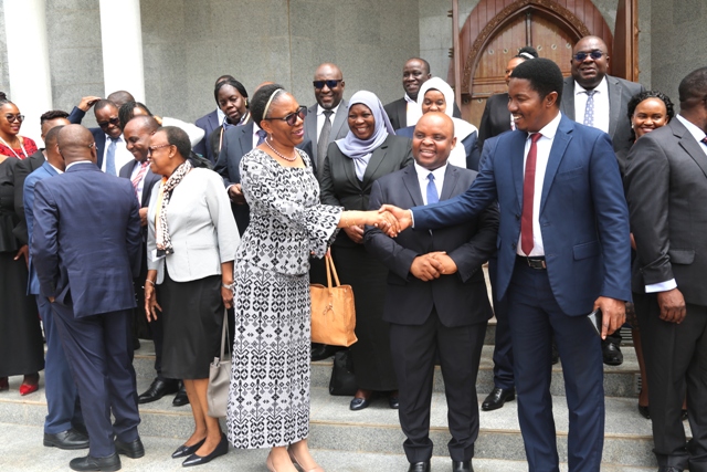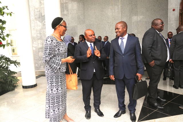 Waziri wa Nchi Ofisi ya Makamu wa Rais (Muungano na Mazingira) Mhe. Dkt. Selemani Jafo na Naibu Waziri Mhe. Khamis Hamza Khamis wakipongezwa na Katibu Mkuu Ofisi ya Makamu wa Rais Bi. Mary Maganga mara baada ya kupitishwa kwa Bajeti ya Ofisi ya Makamu wa Rais kwa mwaka wa Fedha 2023/2024 leo Aprili 24, 2023.