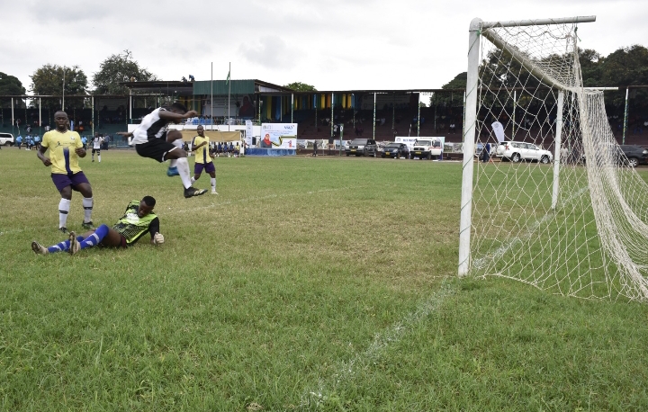 Mchezaji wa timu ya Ofisi ya Rais TAMISEMI, Anord Tryphone akimruka Golikipa wa timu ya Wizara ya Mambo ya Ndani ya Nchi, Green Jairos wakati wa mchezo wa fainali wa soka uliochezwa kwenye Uwanja wa Jamhuri mkoani Morogoro Aprili 29, 2023. Mambo ya Ndani ya Nchi wameibuka mabingwa kwa kushinda bao 1-0.