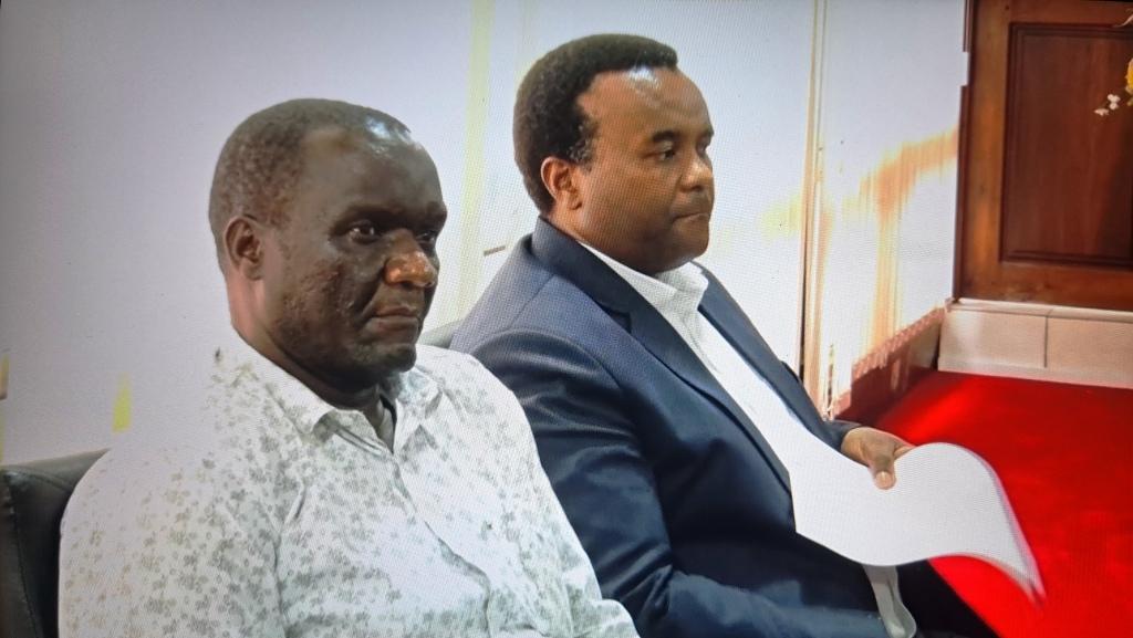 Katibu Mkuu Wizara ya Ardhi Nyumba na Maendeleo ya Makazi Eng. Anthony Sanga (Kulia) pamoja na Mpima wa Wizara ya Ardhi Romanus Sanga wakati wa kikao cha Waziri wa Ardhi Nyumba na Maendeleo ya Makazi Mhe. Dkt Angeline Mabula na waandishi wa habari jijini Dar es Salaam tarehe 29 April 2023. (PICHA NA WIZARA YA ARDHI)
