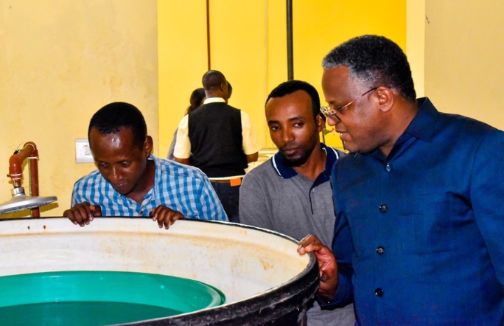 Katibu Mkuu Ofisi ya Waziri Mkuu (Sera, Bunge na Uratibu) Dkt. Jim Yonazi akiangalia moja na mapipa ya kuhifadhia maji katika maabara ya kutotoresha vifaranga vya samaki katika Kituo cha Viumbe Maji (DAQ) kilichopo Kingolwira mkoani Morogoro wakati wa ziara yake kukagua utekelezaji wa program ya kilimo na uvuvi ya AFDP inayoratibiwa na ofisi yake.