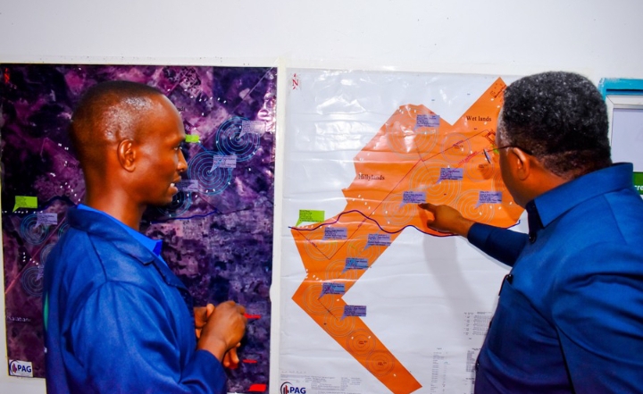Katibu Mkuu Ofisi ya Waziri Mkuu (Sera, Bunge na Uratibu) Dkt. Jim Yonazi akioneshwa ramani na Msimamizi wa shamba la Mbegu Msimba Bw. Samson mollel alipotembelea ofisi za Wakala wa Mbeguza Kilimo (ASA) Wilaya Kilosa Mkoani Morogoro wakati wa ziara hiyo.