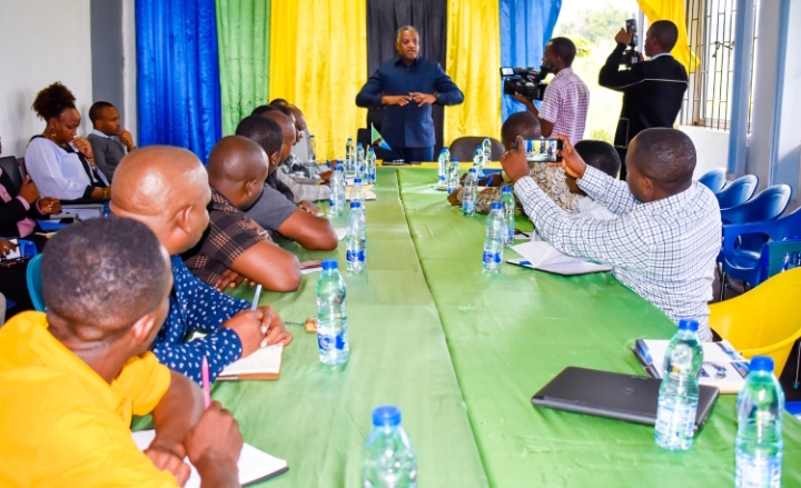 Katibu Mkuu Ofisi ya Waziri Mkuu (Sera, Bunge na Uratibu) Dkt. Jim Yonazi akizungumza na watendaji wa Ofisi za Taasisi ya Utafiti wa Mbegu (TIRA) Ilonga alipowatembelea kujionea utekelezaji wa program ya kuendeleza kilimo na uvuvi ya AFDP katika Wilaya ya Kilosa Mkoani Morogoro.