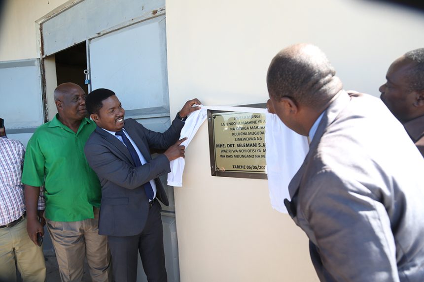 Waziri wa Nchi Ofisi ya Makamu wa Rais (Muungano na Mazingira) Mhe. Dkt. Selemani Jafo akiweka jiwe la msingi la ujenzi wa kituo cha unenepeshaji wa mifugo kinachojengwa katika Kijiji cha Muguda Halmashauri ya Kishapu Mkoani Shinyanga leo Mei 06, 2023 kupitia Mradi wa Kukabiliana na Mabadiliko ya Tabianchi kwa Kutumia Mifumo Ikolojia Vijijini (EBARR) na kuratibiwa na Ofisi ya Makamu wa Rais kwa ufadhili wa Mfuko wa Mazingira wa Dunia chini ya Shirika la Mazingira la Umoja wa Mataifa (UNEP).
